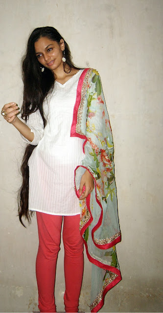 Oh yes! It was a white Monday! I decided I'd go traditional for the day since it is a fairly colorful festival (no, mum had nothing to do with it, honest!). I paired basics that you can find in any Indian girl's wardrobe with a statement piece, aka my fabulous Anushree Reddy scarf! I have to say, I was totally floored by all the compliments I got for this scarf!! You may remember it from my post on Anushree Reddy's collection at Lakme Fashion Week. (If not, you can refresh your memory here).